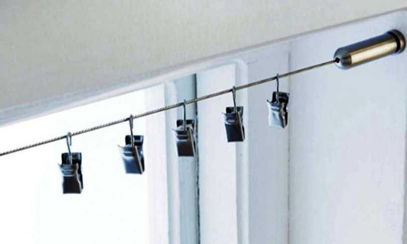 Нередко используют вариант со струной или леской. Ее закрепляют с двух сторон окна и с помощью специальных крючков подвешивают на нее тюль.