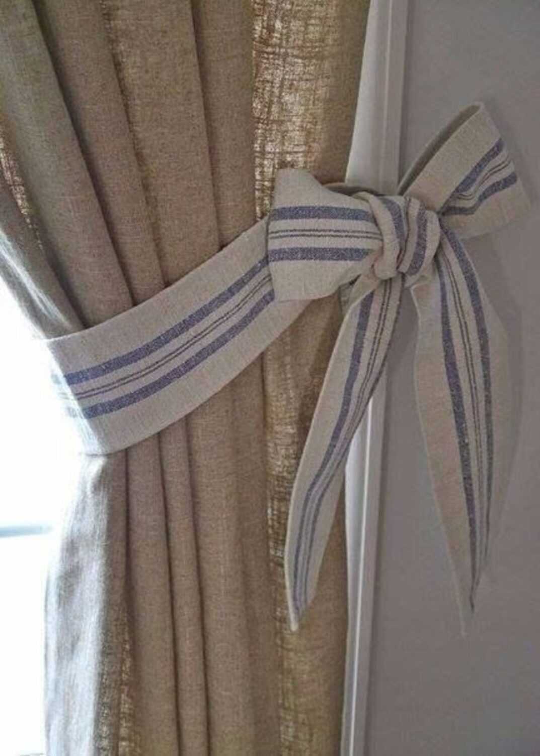 Другой вариант крепления типа петель — завязки. Они выглядят как узелки или бантики. Часто изготовлены из той же ткани, что и занавески и просто пришиты к ним. Иногда завязки подобраны отдельно и могут быть продеты в отверстия.