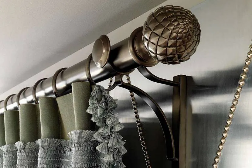 - На багет. Этот вариант способен выдержать тяжелые шторы или портьеры. Отличается возможностью гибко вписаться в любой, даже самый изысканный, интерьер.