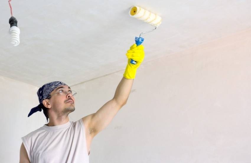 - если потолок оклеен недорогой плиткой из пенопласта, то раз в год ее можно обновлять при помощи окрашивания. Для этого применяют водоэмульсионные акриловые составы. Проводить окрашивание лучше валиком с длинным ворсом, так краска с первого слоя закроет все поры материала, в которых скопилась пыль.