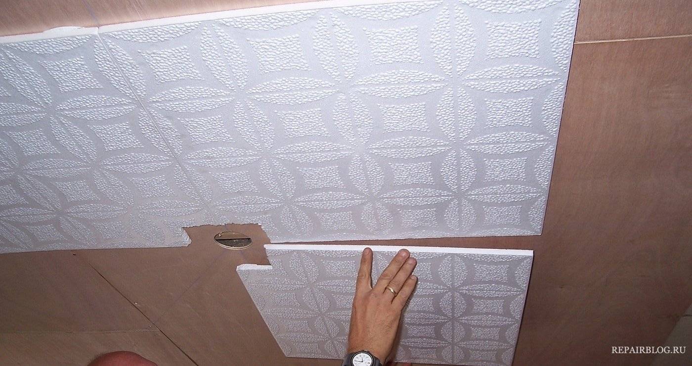 Еще один способ, как приклеить потолочную плитку на неровный потолок. Лучше всего подходит для помещений, в которых перепады уровня невелики. Чаще всего пенопласт применяется при наличии стыков между плитами, которые заделаны раствором. Смесь выдавливается от времени и выступает над поверхностью, поэтому элементы на такую плоскость не приклеить. Вот тут пригодится пенопласт.