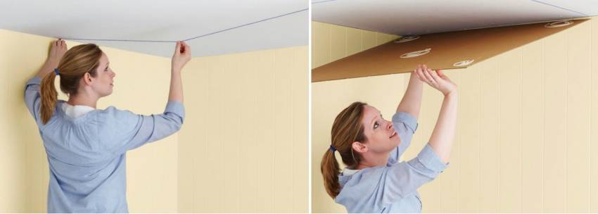 От этого ответственейшего этапа зависит качество всей последующей работы, поэтому производить измерения следует со всей тщательностью. Разметку делают малярным шнуром. Работа с ним предполагает присутствие второго человека, если же помощника взять негде, придется в нужных местах вбивать в потолок какой-нибудь крепеж (гвозди, саморезы по бетону), на которые можно будет закреплять второй конец шнура.