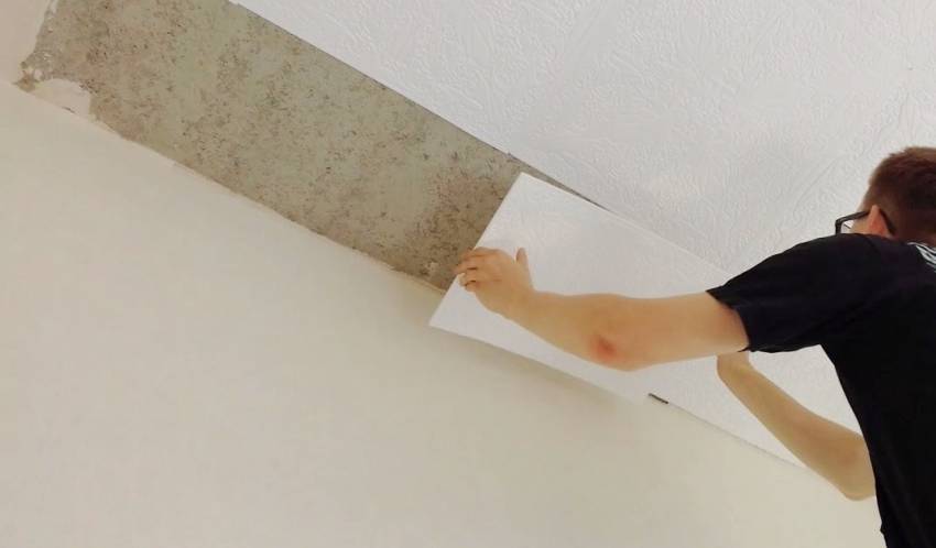 Очистить потолок от отделки можно по нескольким технологиям. Все зависит от того, что находится на потолке. Обои вначале намачиваются, а затем снимаются шпателем. Плитка удаляется также шпателем.