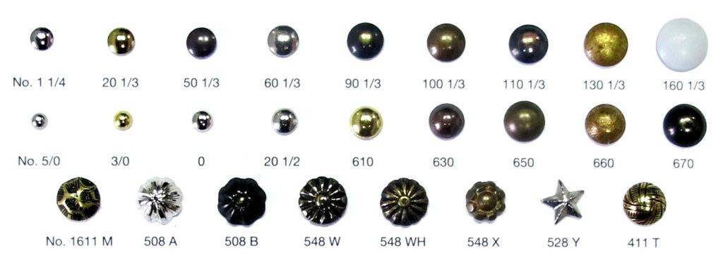 Кроме этого, следует подобрать мебельные гвозди. На них должна быть декоративная шляпка. Эти детали могут быть выполнены из различных металлов, а цвет их может различаться от медного до золотого. Также некоторые шляпки обтянуты дерматином. Диаметр их подбирается из дизайнерской идеи по оформлению двери.