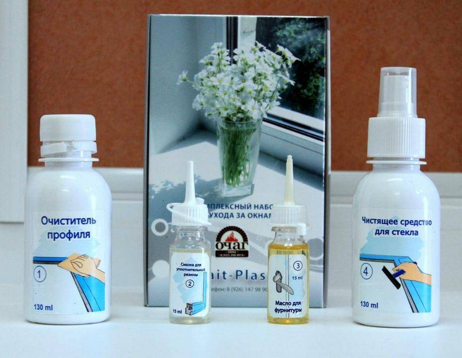 Организация правильного ухода за ПВХ-окнами невозможна без наличия специальных средств. В магазинах по продаже бытовой химии в широком ассортименте есть соответствующие наборы, хотя его составляющие можно подобрать и по отдельности.