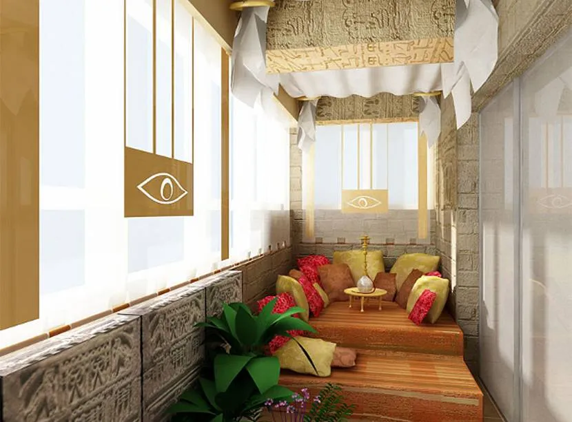 Отдельно стоит сказать о шторах. Имейте в виду, что если вы планируете использовать балкон, как одну из комнат, необходимо грамотно продумать его затенение. Прямые солнечные лучи будут мешать и утомлять, тем более, если вы обустраиваете балкон под комнату отдыха. Для маленького или узкого балкона лучше использовать жалюзи или шторки из полупрозрачных тканей пастельных тонов без рисунка. Тяжёлые занавески могут перегрузить пространство, они более уместны в аутентичном дизайне интерьера для создания камерной обстановки для отдыха. Такой приём подойдёт для больших лоджий при создании зоны отдыха в восточном дизайне.