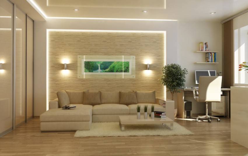 Виды декоративной отделки ниши из гипсокартона с подсветкой своими руками могут быть самыми разнообразными: покрытие водоэмульсионной краской, оформление деревом, пластиком, оклейка обоями и многое другое, чему отдадут предпочтение владельцы помещения.