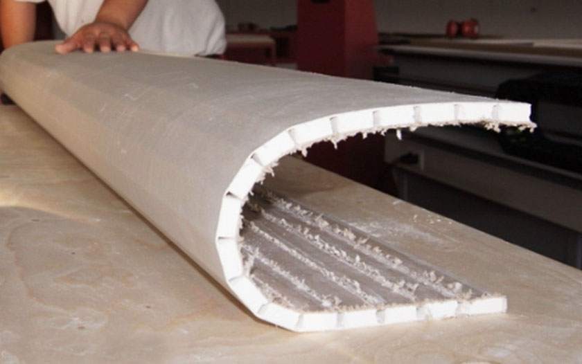 - Прокатать полоски гипсокартона валиком с иголками и смочить поверхность. Деталь изгибают и прикрепляют на каркас, там она и просыхает, приняв нужную форму;