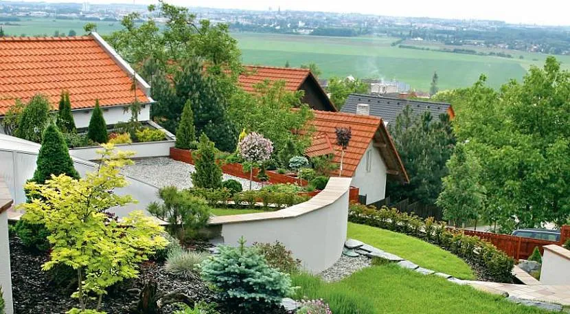 Все высокие постройки, деревья и кустарники не должны визуально перекрывать вид дома посередине или наверху участка. Плавный переход от больших растений к низким аналогам поможет сгладить впечатление от крутизны склона. Обилие дорожек, устроенных, как серпантин, напротив, подчеркнет большой уклон еще больше.