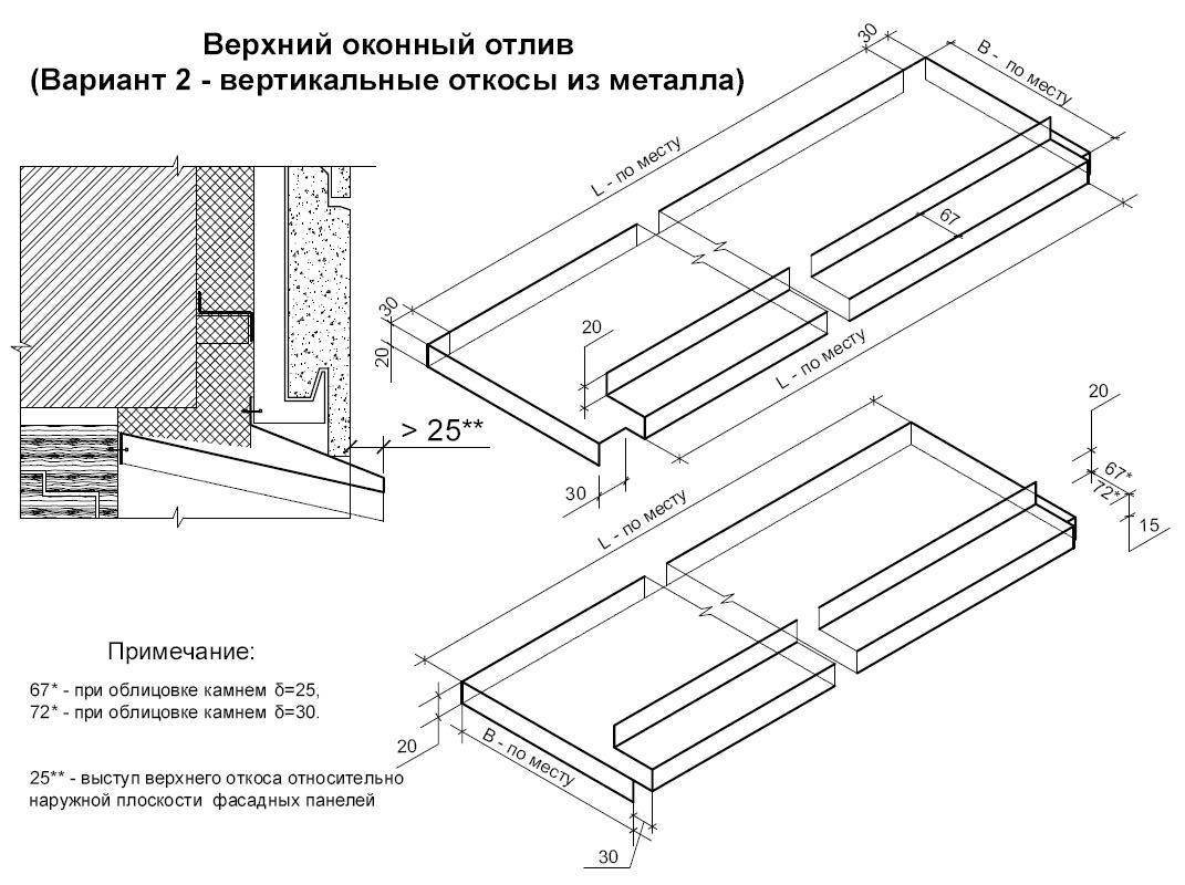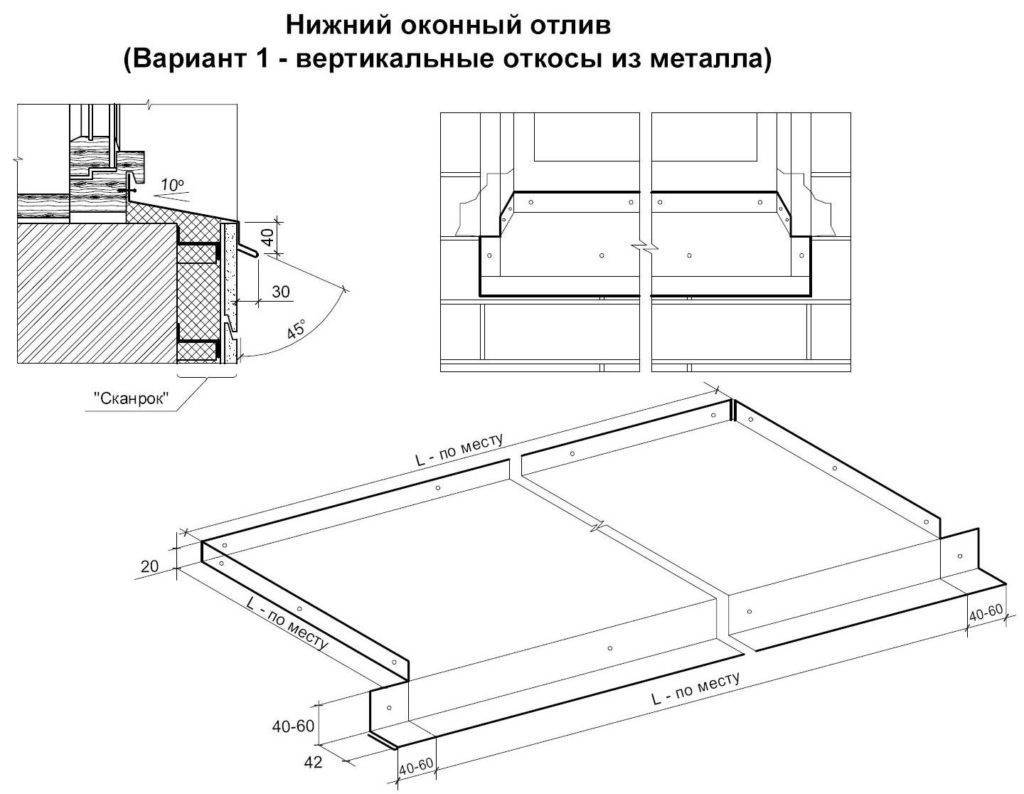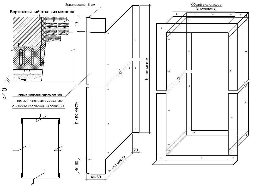Металлический вариант детали уже устоявшийся стандарт, установка которого не занимает много времени даже при условии самостоятельной работы. Монтаж предполагает необходимость точного соблюдения всех условий (Согласно нормам и правилам STO49299418-001 Узлы примыканий оконных и дверных блоков) и монтаж детали в отведенное для нее посадочное место. Своеобразная форма обеспечивает плотное прилегание к боковым стенкам. Монтаж металлических откосов в обязательном порядке предполагает фиксацию, что позволяет обеспечить плотное прилегание всех частей детали.