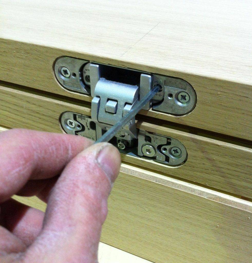 Скрытые петли – это удобный и красивый вариант навесов. Но не имея навыков и соответствующего оборудования, самостоятельно их монтировать очень сложно. Зато регулировку в трех направлениях своими силами выполнить достаточно просто.