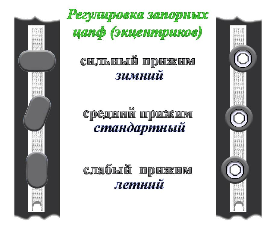 Сезонная регулировка домашнего окна переводом его в режим «лето» или «зима» осуществляется при помощи запорных цапф на боковой стороне открывающейся створки. Они бывают неподвижными прямоугольными либо роликовыми (круглыми с риской на одной из сторон или овальными).