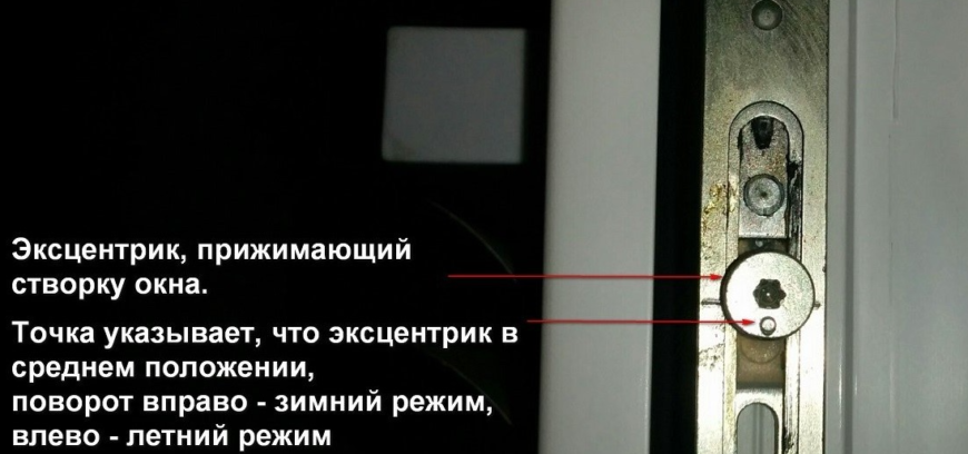 • Посмотреть на положение цапфы (эксцентрика). На круглой цапфе есть черточка (точечка, звездочка), по которой можно оценить режим. Если черточка сориентирована в сторону помещения – это зимний режим, если в сторону улицы – летний.