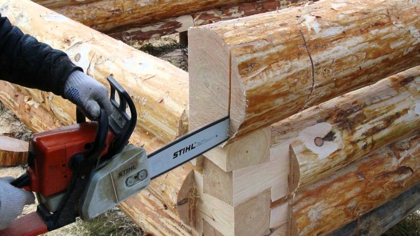 - В первом случае отверстия создаются уже после завершения строительных работ. При этом в венцах, расположенных в местах будущих проемов, предварительно оставьте небольшие зазоры (габариты последних зависят от размеров монтируемых изделий). Когда завершите укладку бревен, просто прорежьте проемы бензопилой.