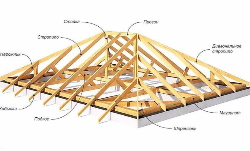 - угловых накосных стропил, соединяющих брус конька и карнизные углы кровли. Являются основными несущими элементами в количестве 4 единиц;