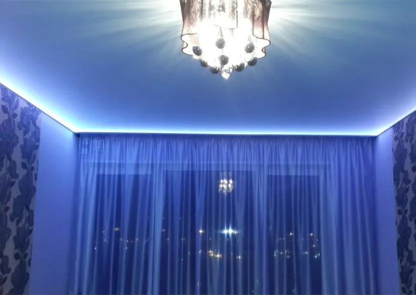 - Парящий натяжной потолок с нишей под гардину. Элегантный вариант маскировки потолочного карниза: светодиодная лента создаёт романтическую подсветку, а конструктив остаётся вне зоны видимости. Чтобы увеличить эффект, можно сделать отступы от всех стен, а не только со стороны окна. Достоинство парящего потолка – красота, недостаток – сложность работы, которая отражается на стоимости.