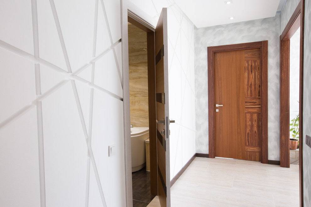 Есть также еще один вариант решения, в том случае, когда цвет дверного полотна нужно подобрать под каждую отдельную комнату — покрыть шпоном двери. Такие дверные коробки выполняются под заказ и требуют дополнительных затрат, но конечный результат будет стоить того.