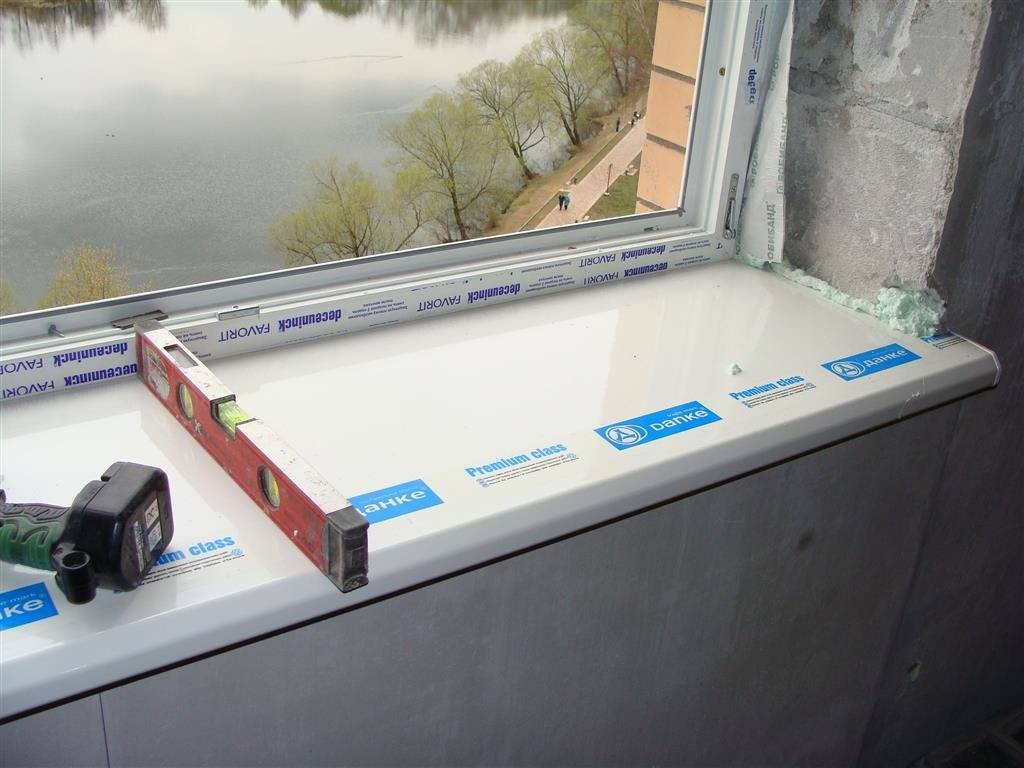 Процесс установки подоконника требует аккуратности и строгого соблюдения определенных правил. Независимо от материала, изделия монтируются по общему принципу. Производим необходимые замеры. Добавляем 1-2 см для углубления элемента. Делаем перфоратором в стене пазы и вставляем подоконник. Укладываем под него деревянные клинья, выравниваем по ватерпасу.
