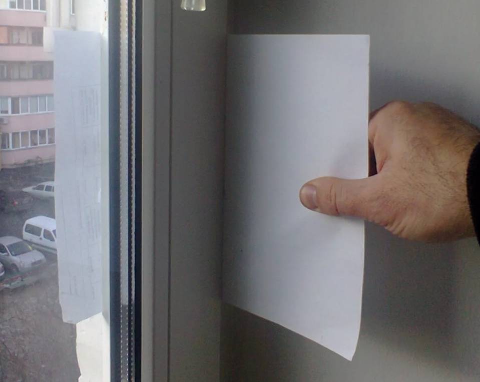 лист бумаги. Обычный лист бумаги прижимается окном (вкладывается в открытое окно и зажимается полным закрытием створки), если потянуть за угол листа и он легко вытягивается, значит уплотнитель недостаточно прижимается (это может указывать на то, что окно работает в летнем режиме, старый уплотнитель в таком режиме плохо прижимается к раме).