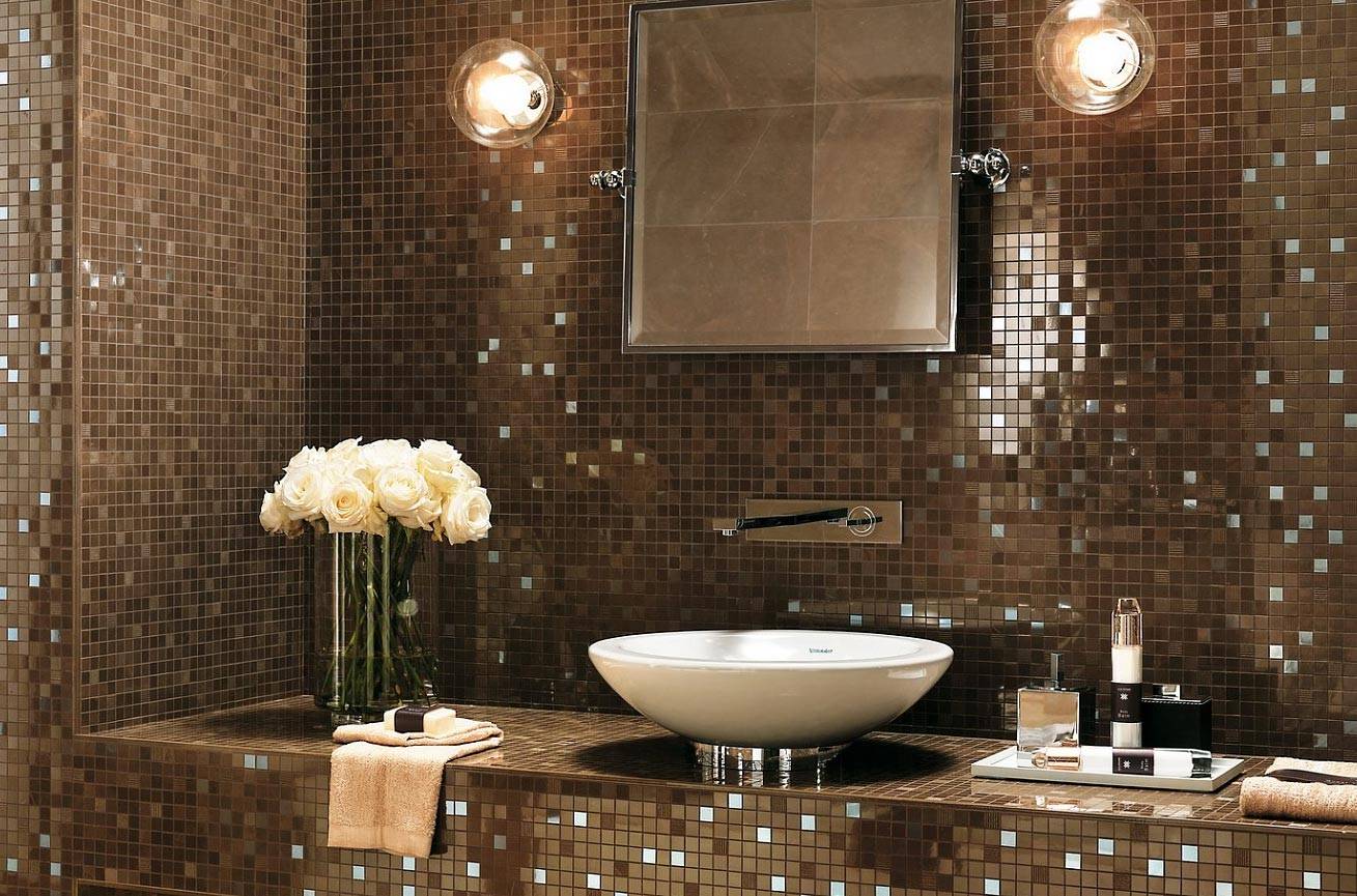 Основа – латунь, нержавеющая сталь. Основные достоинства такой мозаики – прочность, устойчивость к воздействию температур и механическим повреждениям. Подходит для облицовки стен и пола, однако, может выглядеть очень грубо, поэтому использовать её нужно только в определённом дизайнеинтерьера ванной плиткой мозаикой, умело сочетая с мебелью и потолком.