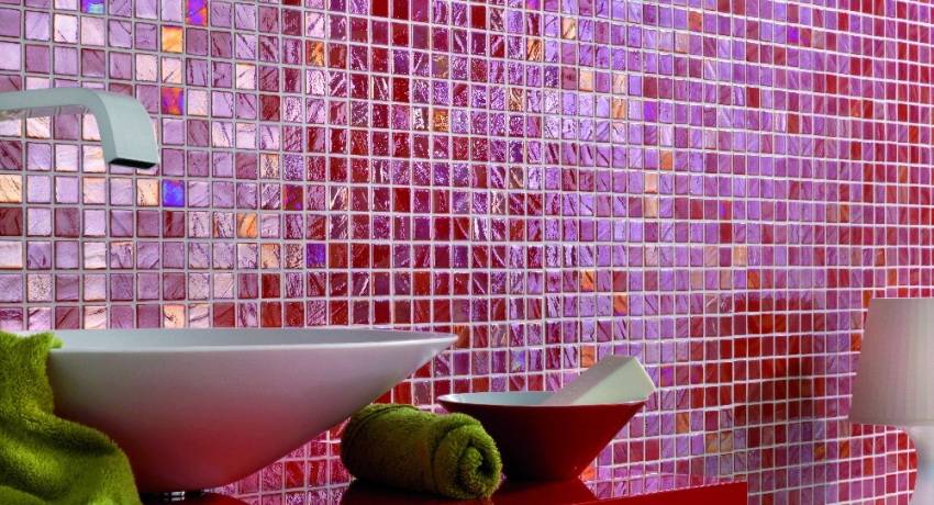 - мозаика из оранжево-фиолетового цвета наполнит интерьер ванной комнаты уютом, сочностью, теплотой;