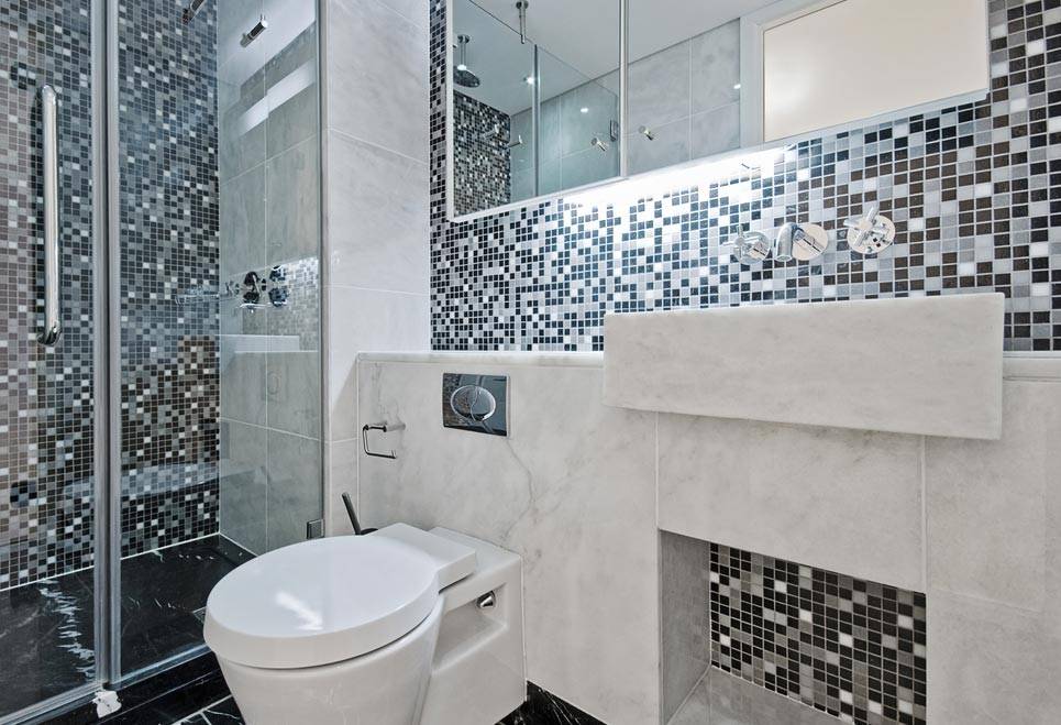 При помощи мозаики просторную ванную разделите на функциональные зоны: душевую, раковину, туалет. Для оформления подойдёт глянцевое покрытие. Тёмные оттенки лучше оставить для облицовки деталей.
