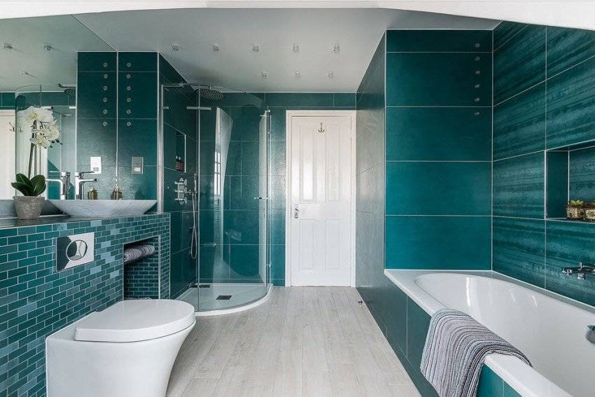 А также стоит отметить, что угловая укладка способствует зрительному расширению помещения. Однако при таком монтаже существуют и некоторые минусы. Основной из них – необходимость нарезки материала для его подгонки. Дизайнеры рекомендуют использовать один или два оттенка при облицовке стен таким способом. Существуют и другие идеи ремонта ванной, но в любом случае нельзя сочетать более трех цветов.