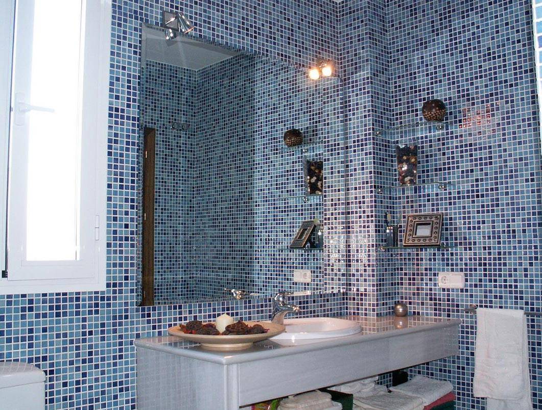 При обстоятельствах, когда мозаика в ванной комнате укладывается по стене над ванной, следует отдать предпочтение материалу глубокого синего цвета.