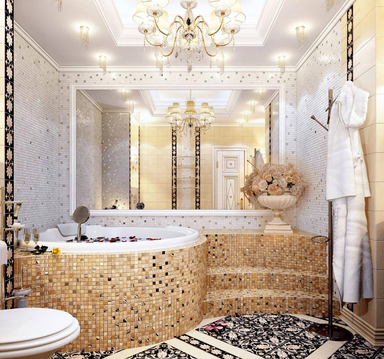 - чтобы водные процедуры по утрам заряжали бодростью на весь день, а вечером вы могли бы приятно расслабиться, оформление мозаикой в розовом цвете, с применением золота, не только наполнит ванную теплотой, но и расширит пространство;