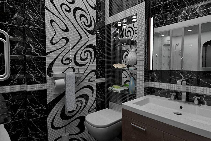 Если вы хотите оформить помещение, применяя мозаику черного или красного цвета, для такого решения подойдет ванная с большой квадратурой. Такая мозаика в ванной, фото которой представлены внизу статьи, хорошо будет выглядеть с контрастной затиркой, большим количеством зеркал, светлым потолком и достаточным количеством освещения.