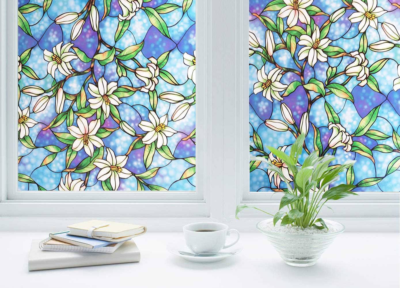 - Витражная, или архитектурная. Витражный тип пленки используется для декорирования окон, витрин, прозрачных перегородок или застекленных дверей. С ее помощью можно быстро и дешево создать имитацию витража, либо украсить окно любым изображением на выбор. Витражная пленка не только украшает, но и защищает помещение от избытка солнечных лучей.