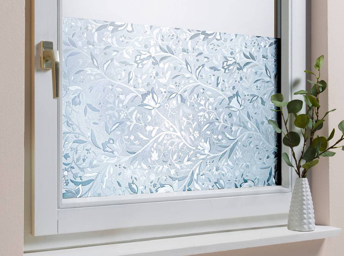 Узор, созданный за счет прозрачной самоклеящейся витражной пленки с орнаментом, является альтернативой композиции из кусочков стекла, выполненной по технологии Тиффани.