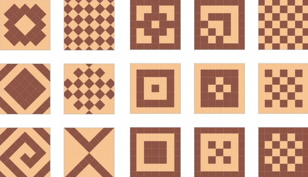 - Шахматная кладка. Здесь используется квадратный кафель разного цветового оттенка. Его размещение на поверхности осуществляется по очередности.