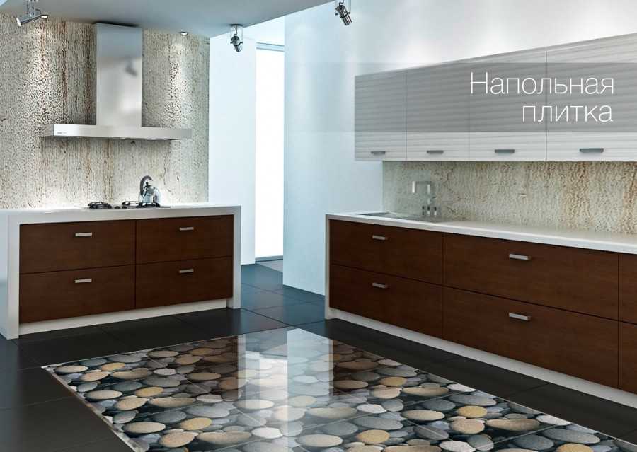 Благодаря уникальному рисунку, напольная плитка, может иметь имитацию малахита, базальта или даже самых обычных камней, например морской или речной гальки.