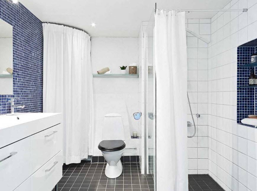 В плане практичности дизайнеры рекомендуют использовать классическую темно-светлую комбинацию цветов. В целом темные оттенки для плитки предпочтительнее, но с их использование стоит быть осторожным. Полностью темная комната превратится в черную дыру, а не «изюминку» квартиры.