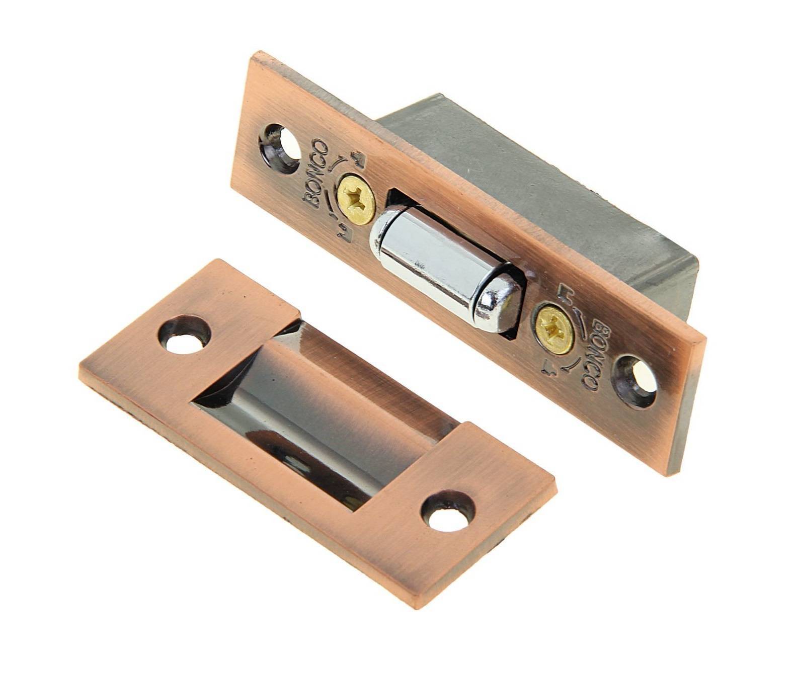 Принцип действия такого фиксатора полностью идентичен роликовой конструкции. Металлический подпружиненный элемент, представленный в виде обратного треугольника, углубляется в паз и фиксирует дверную конструкцию. Но есть одна отличительная особенность, которая отражается на процессе монтажа, чтобы открыть дверь, недостаточно просто нажать, так как защелка устанавливается в паз по плоскости и не выскальзывает обратно.