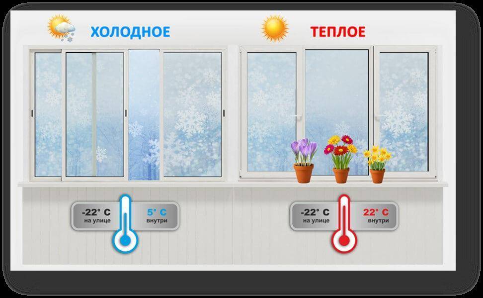 Регулирование внутренней температуры при холодном и теплом остеклении.