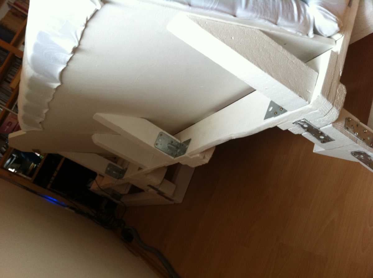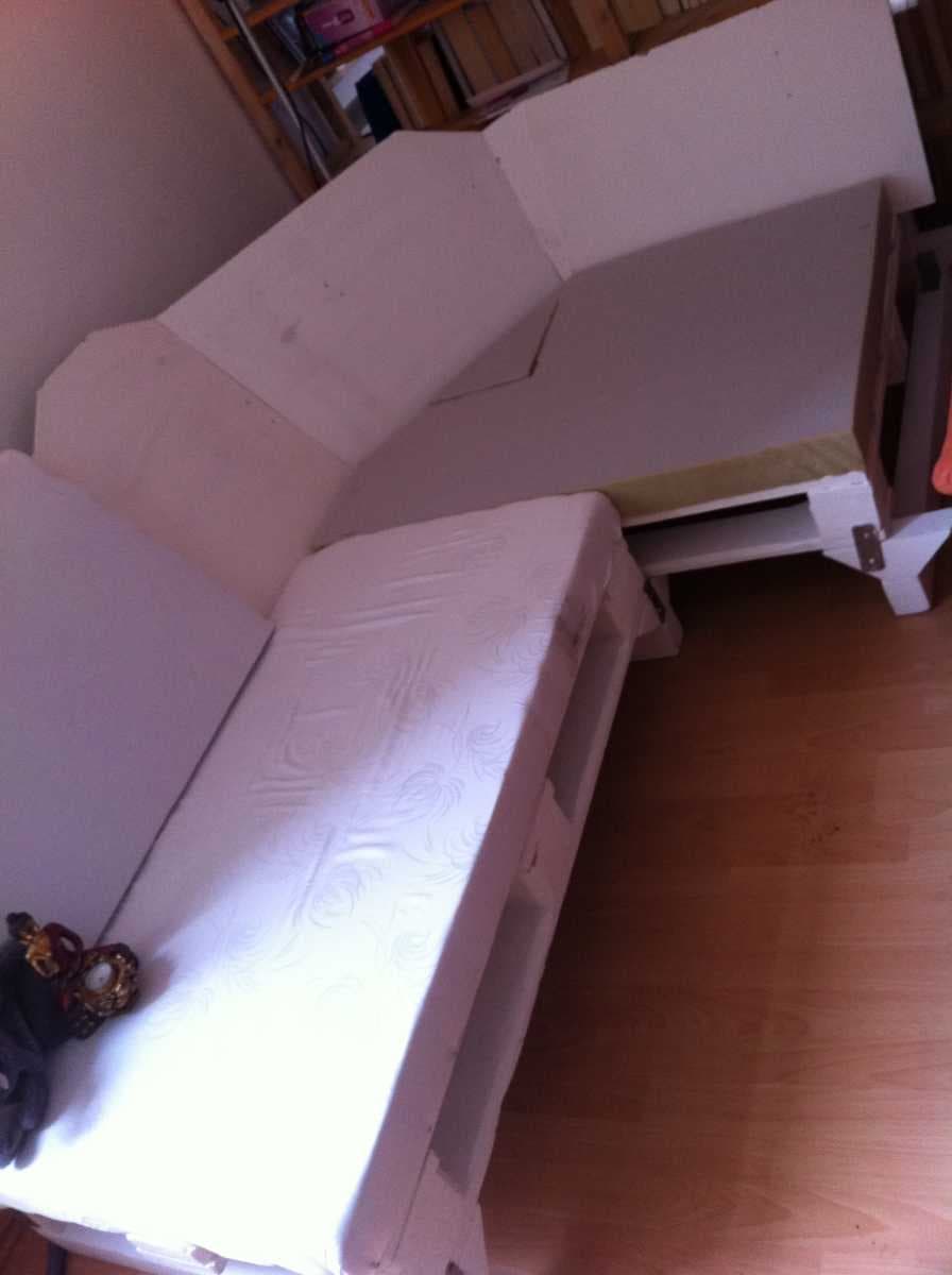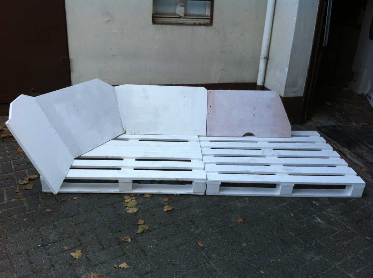Обрабатываем лист фанеры наждачной бумагой, наносим грунтовку, а также краску белого цвета. После полного высыхания фиксируем его в качестве спинки дивана.
