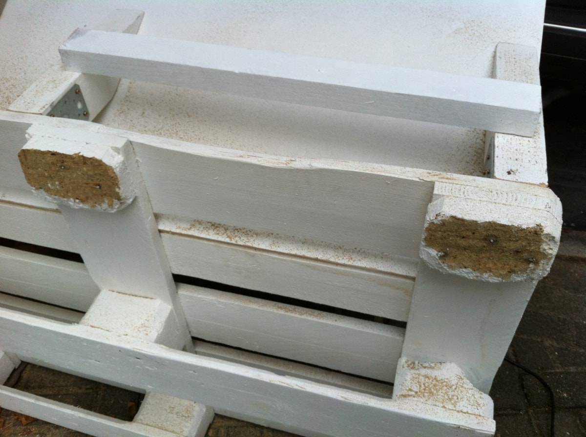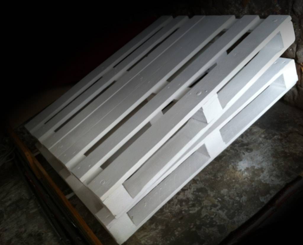 В первую очередь очищаем поверхность поддонов, обрабатываем наждачной бумагой и прокрываем грунтовкой. Только после этого наносим краску белого цвета и оставляем до полного высыхания.