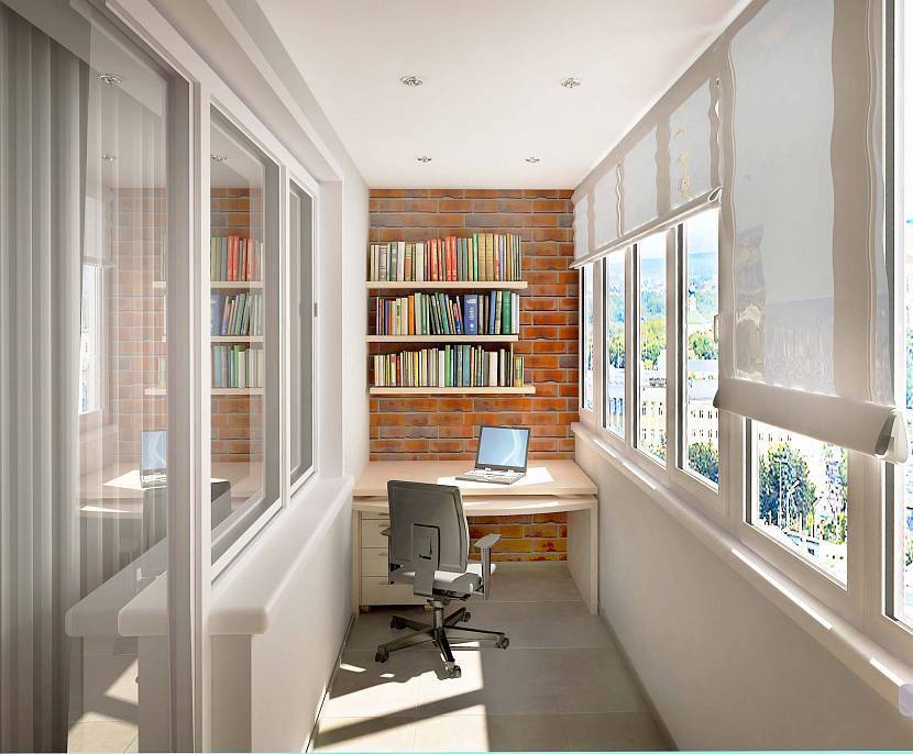 Не меньшей популярностью пользуются рабочие кабинеты на лоджии в квартире, где балкон совмещен с залом, кухней или гостиной. Если помещение застеклено и есть подоконник, то функционального места будет меньше. Поэтому нужно выбирать небольшую модель стола, компактное кресло и многоярусный настольный стеллаж. В результате все детали для работы поместятся в одном углу. Если помещение узкое, а зона возле стола получилась слишком темной, придется подумать об установке дополнительного настольного светильника или настенного бра с рассеивающими лучами света.