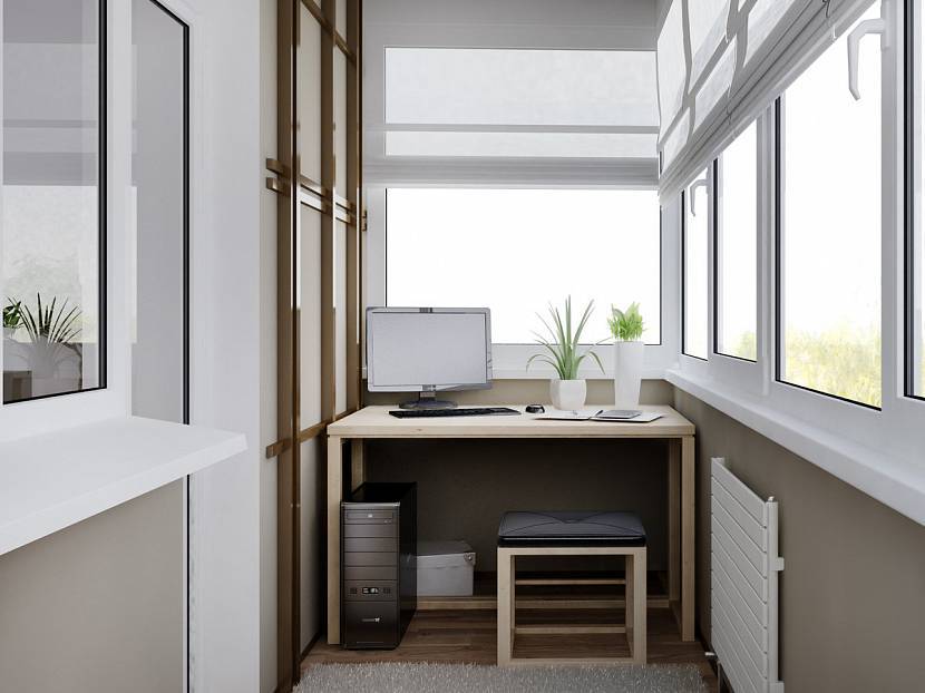- Очень маленькое пространство тоже не позволит вместить рабочий стол и даже кресло. Нужно определить, позволяет ли размер лоджии разместить необходимую мебель.