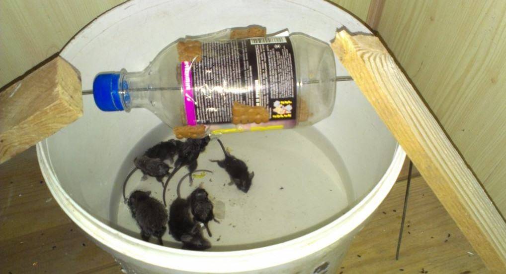 Мыши, чуя приятный запах еды, взбираются по созданному помосту на край ведра и пытаются попасть на бутылку. Из-за свойств пластика, а также из-за кругового движения на оси грызуны падают в нижний сосуд, оставаясь там до прихода хозяев. Этот вариант является одним из самых действенных и остроумных.