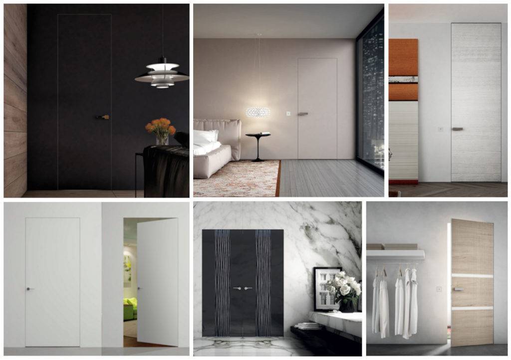 Дверь, имеющая уникальное строение, с рамой вместо дверной коробки. Рама встраивается в стену, в одной плоскости со стеной, наличники не нужны. Сами скрытые двери межкомнатные, можно замаскировать под цвет стен.