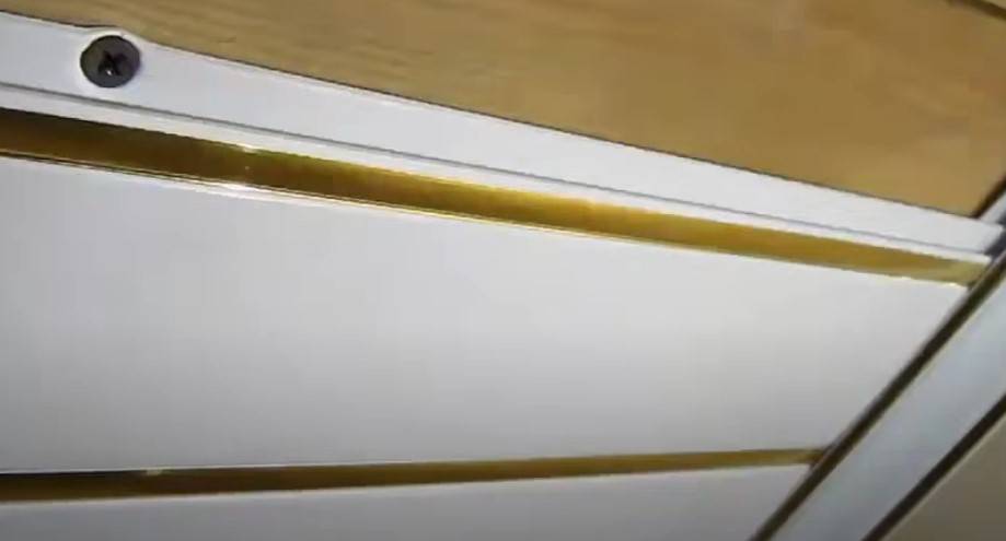 Мастера советуют измерить площадь потолка и уточнить, какой именно кусок панелей останется для завершения выкладки. Бывает так, что в начале выкладки от плинтуса до золотой вставки ширина белой панели — 80 мм, а в конце размер чудесным образом уменьшается. Чтобы избежать подобного момента, нужно заранее измерить площадь потолка и предварительно выложить ламели на полу – это позволит получить идеальный рисунок отделки.