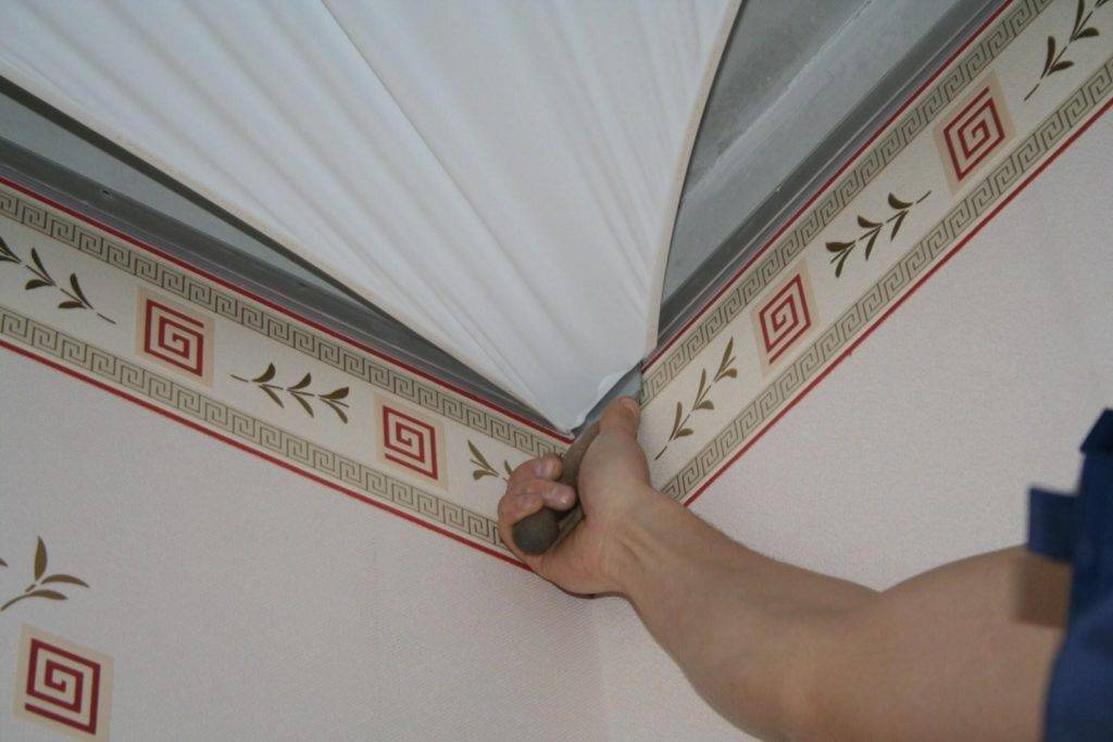 - Далее при помощи лопатки заводят полотно за профиль, начиная с углов.