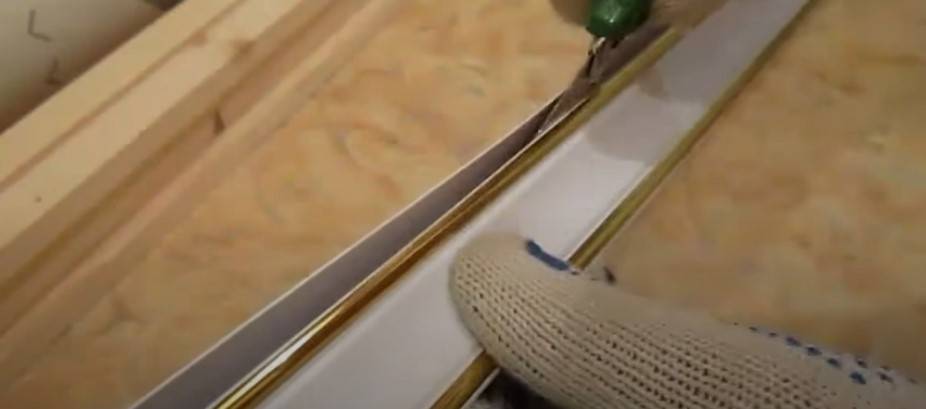 Если не хочется портить панель, ее можно закрепить жидкими гвоздями, но на саморез надежнее. Четвертый потолочный плинтус нужно также отмерить, отрезать и оформить уголки на 45 градусов. После этого отрезают пазовую часть, наносят на боковые части жидкие гвозди.