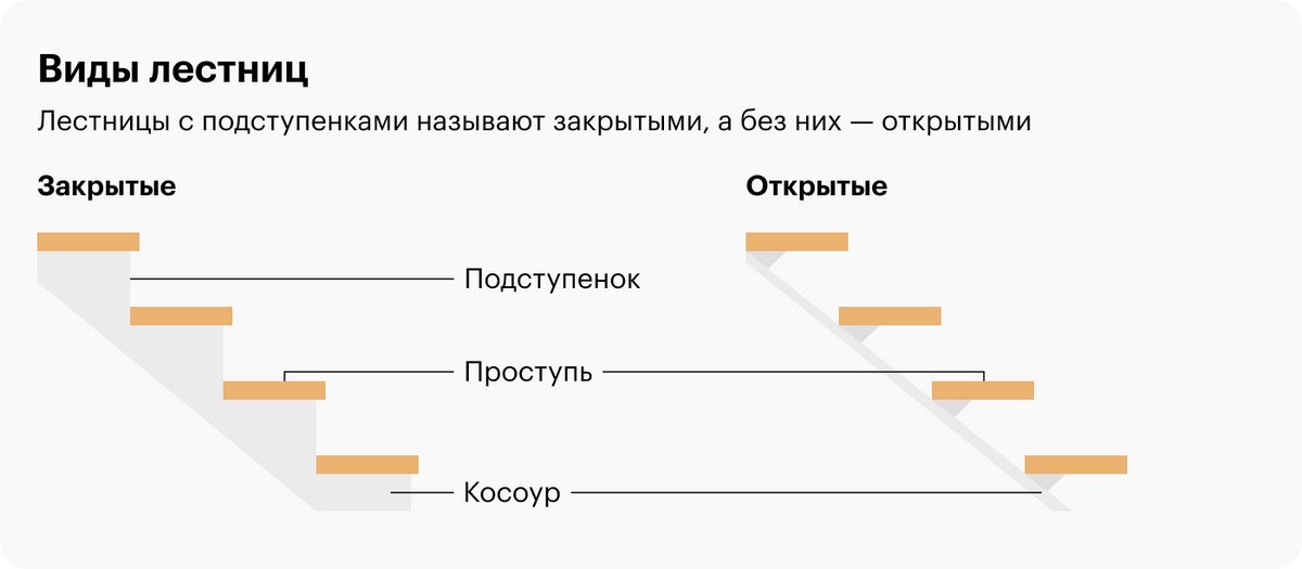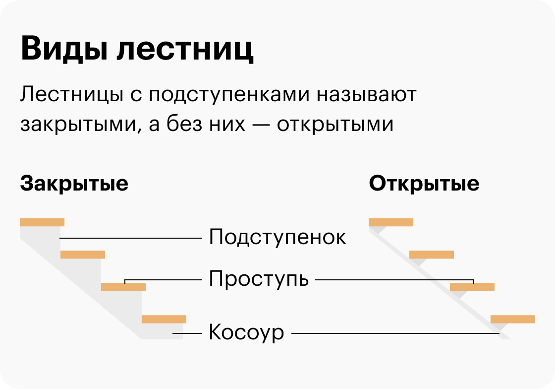По оформлению лестницы делят на открытые и закрытые в зависимости от подступенков — декоративных элементов, которые крепятся перпендикулярно ступеням и закрывают внутреннее пространство лестницы. То есть с подступенками лестница зашита наглухо, без них — между ступенями пустота.