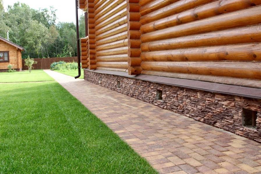 Иногда основание деревянного дома по периметру (по стене) покрывают плиткой или другим материалом, который имеет более высокую прочность и влагоустойчивость. Главное: оставить внутри место для движения древесины и защитить стык сверху от попадания влаги.