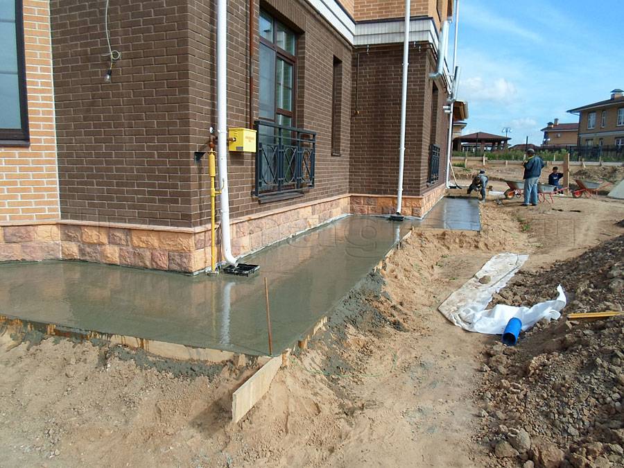 - Так как слой бетона имеет небольшую высоту, правильная заливка отмостки производится за один прием