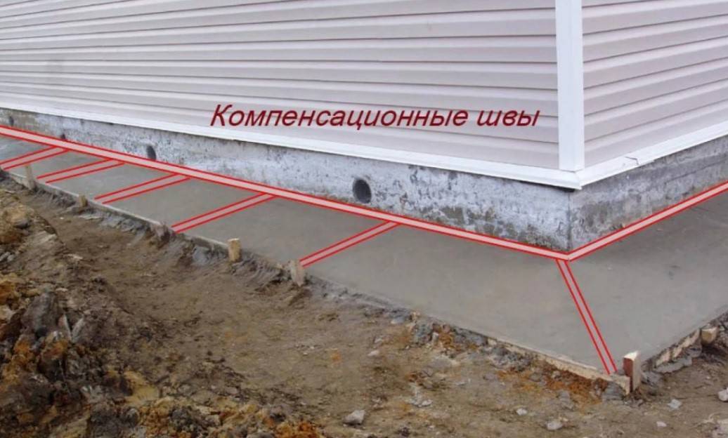 Ширину пояса рассчитывают с учетом его уклона (должен составлять не меньше 2°) и размеров кровельных свесов. Желательно, чтобы твердое покрытие выступало за линию карниза не меньше, чем на 20 см. Между стенкой фундамента и основанием отмостки по всему периметру выполняют компенсационный шов. При заливке бетоном опалубку устанавливают с зазором в 1-2 см так, чтобы засыпать освободившееся пространство гранулами пенополистирола или залить его битумом.